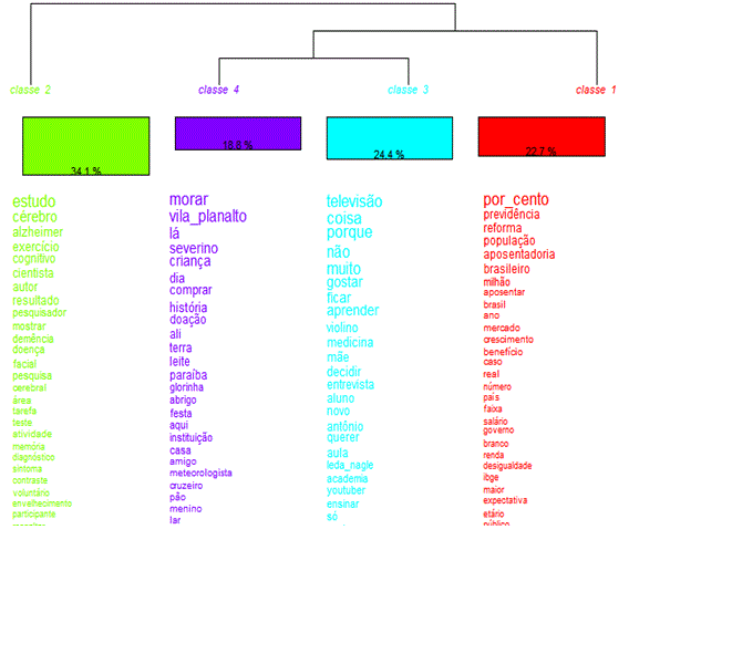 - Figura 1 – Dendograma das classes e frequências de palavras das notícias veiculadas pelo Correio Braziliense sobre velhice e envelhecimento entre 10/2017 a 02/2018. Brasília, DF, 2018.