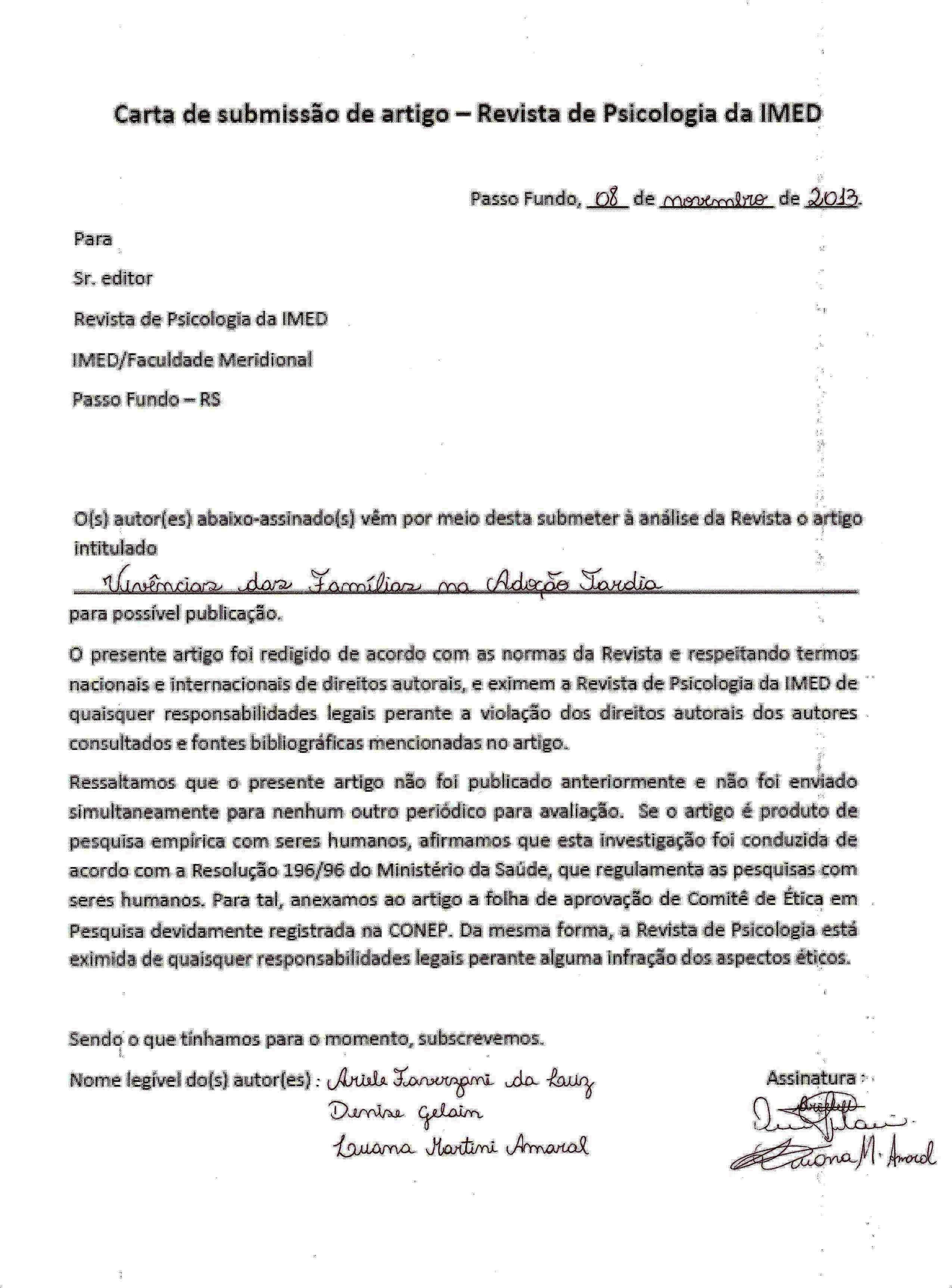 Adoption is a topic that involves many prejudices and expectations. The late adoption includes the same placement. It is known that adopting a child and/or adolescent denotes intense feelings, expectations about the future and resignation of the early years of the development of the son to the late adopters’ couples. The overall objective was to identify the feelings of the families’ adopters and explore their perceptions and experiences about the late adoption process. The specific objectives were to identify the main experiences in this process; meet the psychological and legal aspects; and observe the main feelings and expectations of families enabled the late adoption. In this sense, the survey sought to investigate how it was experienced the late adoption by five families in the city of Passo Fundo, Rio Grande do Sul. Furthermore, was developed as an exploratory qualitative oriented study. Thus, semi-structured interviews were carried out, recorded and transcribed for after exploitation by the method of Bardin’s Analysis Content. The survey results showed that the late adoption is, at the same time, a good and challenging experience, while a process that naturally involves difficulties and facilities, which are related to life experiences of each couple with the child adopted.Downloads